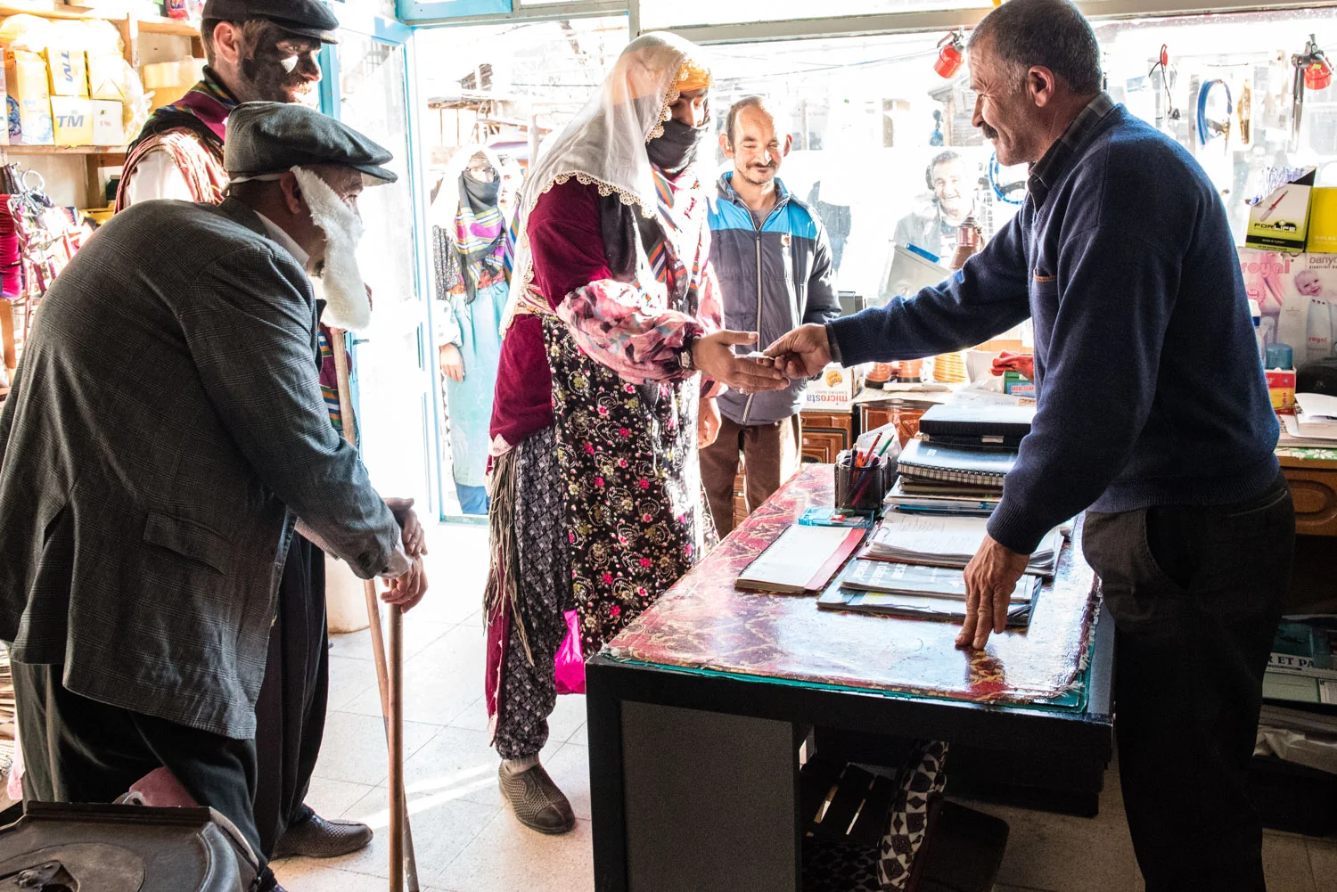 While musicians beat drums and play zurnas (oboe-like wind instruments), these three characters, sometimes joined by others in traditional dress, go from door to door, house to house, shop to shop, collecting food and, nowadays, money
