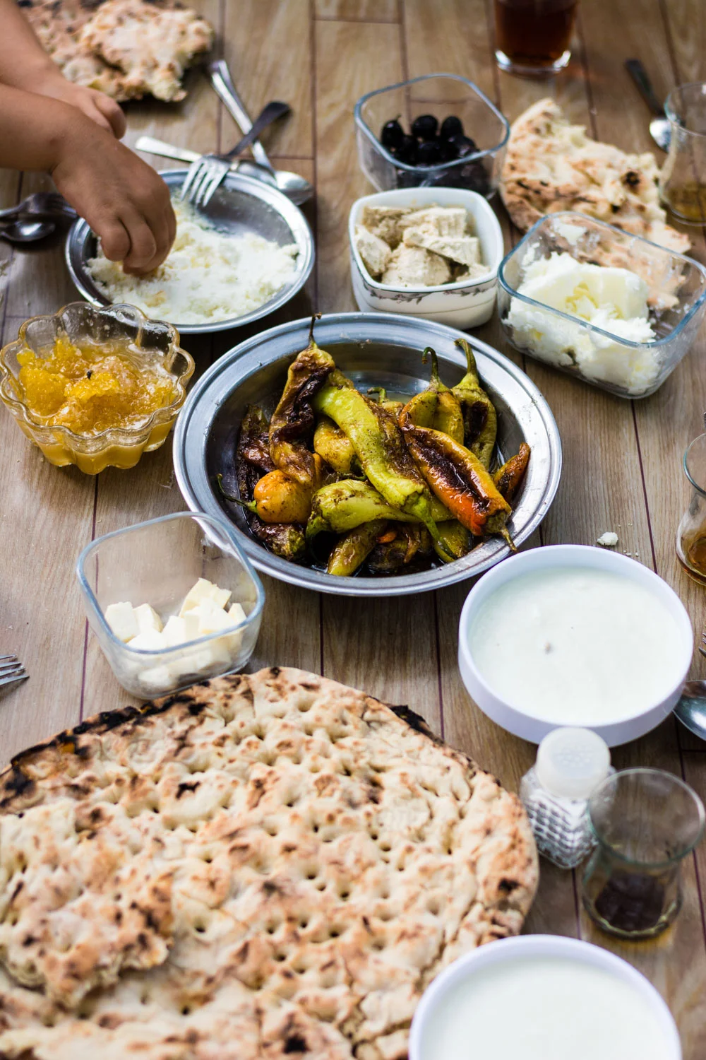 A typical meal in the Munzur Valley - nearly everything is homegrown or homemade. The peppers come from straight from the family's garden, sauteed in butter from the family's cow; the cheese comes from the family's sheep and goats; the honey comes from the family's beehives. The bread is baked on a pan over a fire. Even many people who live in town keep a small plot for vegetables, and a few animals for fresh dairy products.