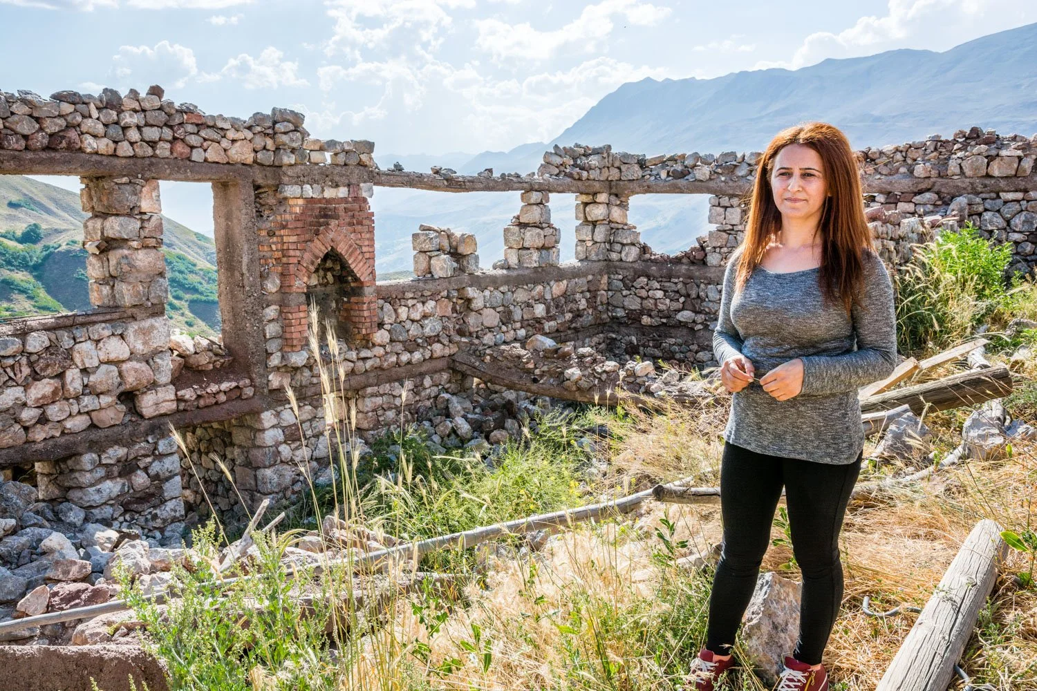 Nurcan Gündoğdu, inside the ruins of her family's home, which was destroyed by the Turkish military in 1994.