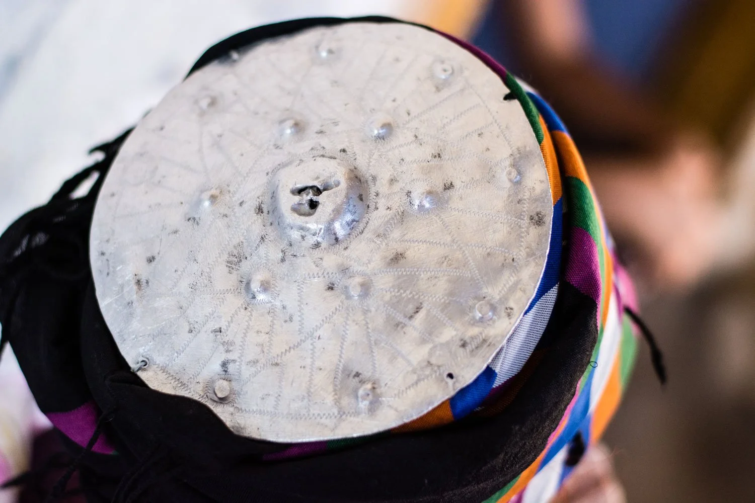 The round metal taç was traditionally worn atop a headscarf called a puşi. Very few people wear the taç today.