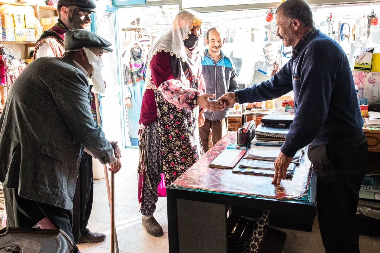 While musicians beat drums and play zurnas (oboe-like wind instruments), these three characters, sometimes joined by others in traditional dress, go from door to door, house to house, shop to shop, collecting food and, nowadays, money.