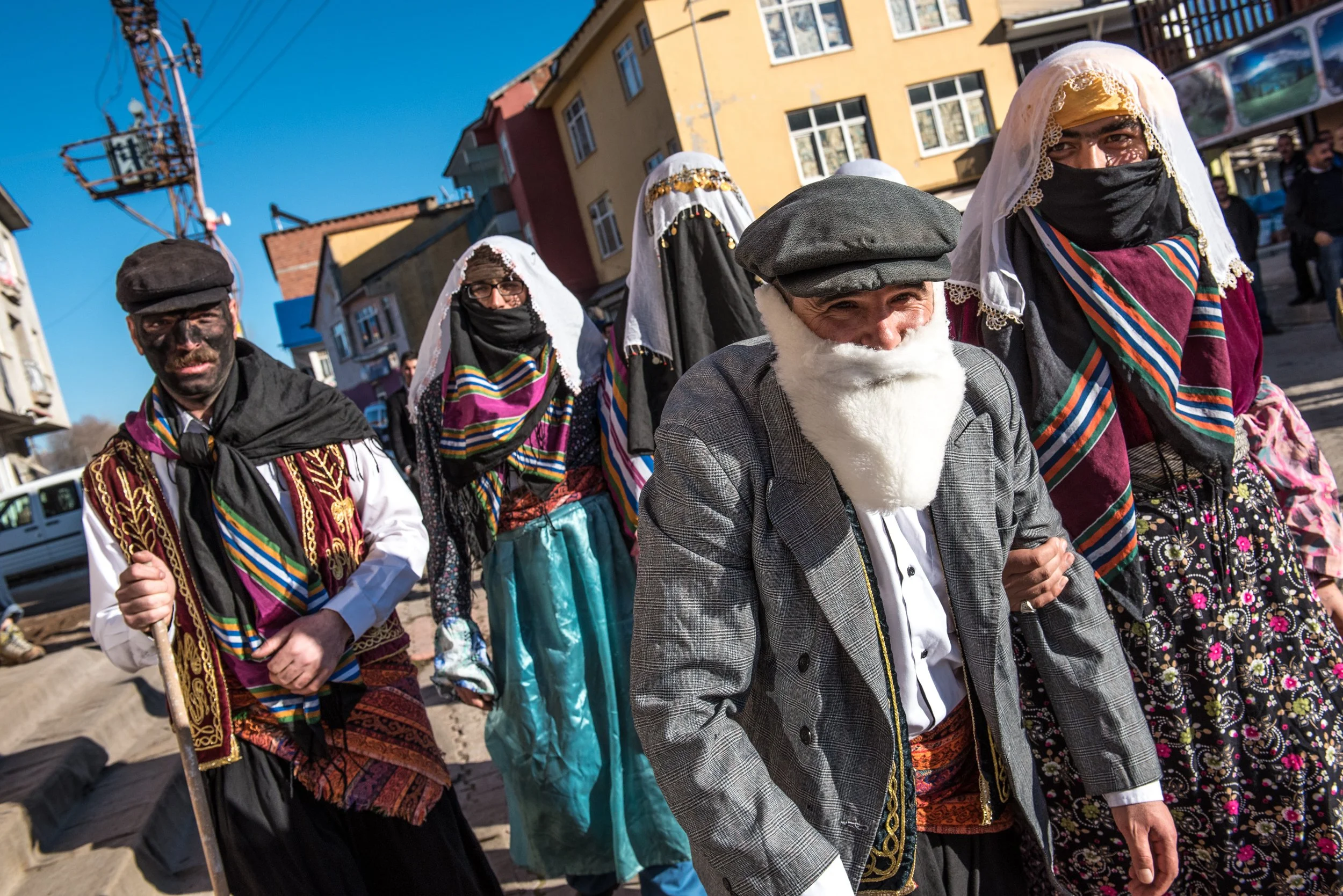 The centerpiece of the festival is a procession called Khalkek, in which several men dress up in costume and parade around their town or village. One of the performers, representing the outgoing Sultan, wears a white beard and carries a cane, or other accessories of old age. Another performer, representing the world itself, is made up as a beautiful woman. A third performer, representing the incoming Sultan, is dressed as a young man with a blackened face – it is said that his face is dark because his star has only just begun to rise in the world of ‘batın’ (the inner, spiritual world), and its light is not yet able to be cast into the outer world (that will have to wait until March, at which time he will actually claim his throne)